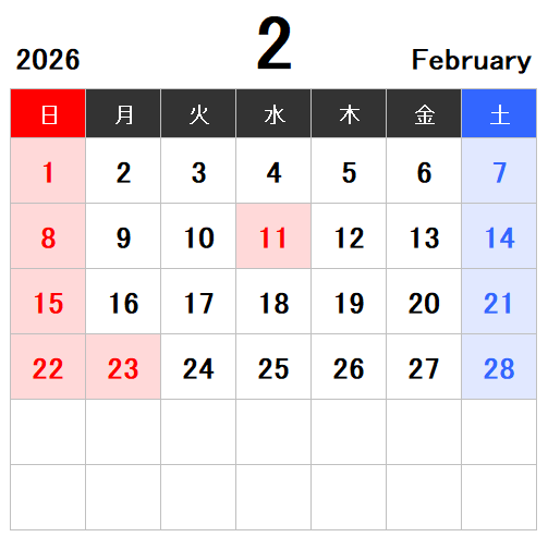 HOME お知らせ 2026年2月定休日のお知らせ 2026年01月31日 2026年2月定休日のお知らせ 2026年2月の定休日は11日(水・祝)、23日(月・祝)、毎週日曜日です。 月~土曜日は通常営業しております。 ご来店いただく際にはマスクの着用をお願いいたします。 営業時間:8:00~17:00 定休日:日・祝日 一覧へ戻る