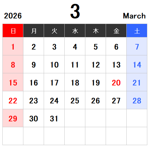 HOME お知らせ 2026年3月定休日のお知らせ 2026年02月28日 2026年3月定休日のお知らせ 2026年3月の定休日は1(日),8(日),15(日),29(日)です。 引越シーズン対応のため、20(金・祝),22日(日)は日曜・祝日も臨時営業いたします。 そのほかの月~日曜日は通常営業しております。 ご来店いただく際にはマスクの着用をお願いいたします。 営業時間:8:00~17:00 一覧へ戻る