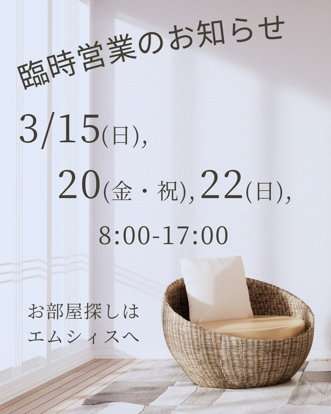 HOME お知らせ 3/15(日),3/20(金・祝),3/22(日)臨時営業のお知らせ 2026年03月14日 3/15(日),3/20(金・祝),3/22(日)臨時営業のお知らせ 引越しシーズンが本格的にスタートしました。 エムシィスでは、皆さまのお部屋探しをサポートするため下記日程にて臨時営業を行います。 3/15(日)8:00~17:00 3/20(金・祝)8:00~17:00 3/22(日)8:00~17:00 お問い合わせお待ちしております。 一覧へ戻る