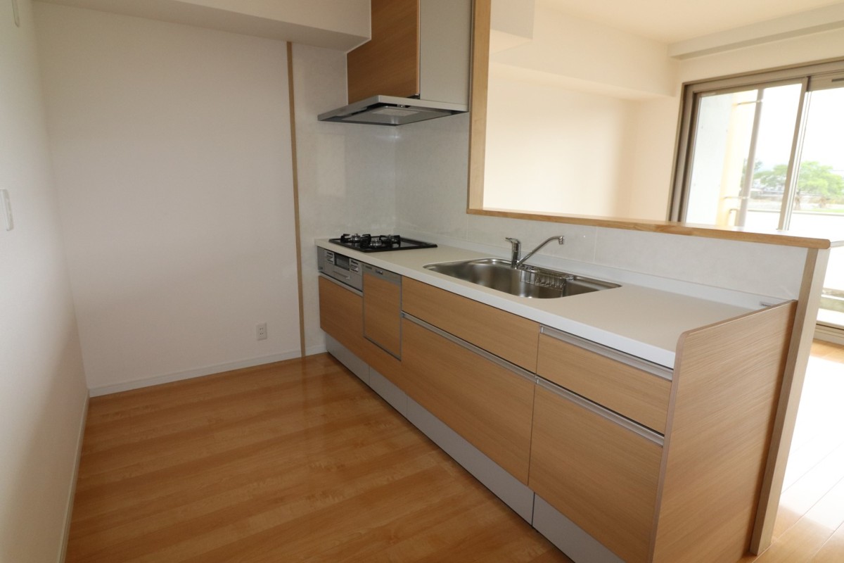 明るいセミオープンキッチンはビルドインコンロ、食洗器付と設備充実。