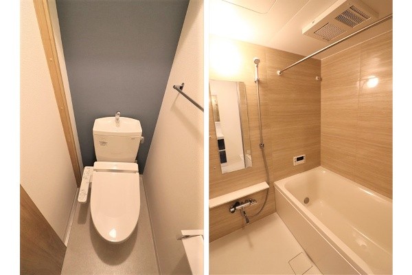 セミオープンキッチン(対面タイプ・ビルドインコンロ付)、冷暖房エアコン(1台付)、追焚機能浴室、浴室乾燥機、シャワー付洗面台、室内洗濯機置場、温水洗浄便座、バストイレ別、モニタ付インターホン